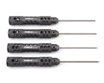 The ProTek R/C "TruTorque SL" Metric Hex Driver Set features large 20mm diameter handles with machined relief holes and cross hatch knurling to reduce weight and provide a high grip surface. The end of the handle features a rotating end cap that allows the tool to spin in your palm, maximizing comfort during long wrench sessions. Plus, the tip size is laser etched in not one - but the THREE different spots on the handle to help simplify identification.