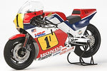 Despite having taken the 1983 500cc Road Racing World Championship Grand Prix Riders' Championship (their first since 1967) on the 2-stroke V3 engine NS500, Honda were not satisfied with their motor and felt that more power would be required. Thus, the Japanese motorcycle giant came up with a single-crankshaft V4 design engine, which was used in their 1984 entry. It featured a unique aluminium frame to house the engine and a radical layout in which the expansion chambers and the fuel tank were positioned above and below the engine respectively. The bike would go on to compete in road races over the next 19 years, and now appears as a 1/12 scale model in the Tamiya line-up.
