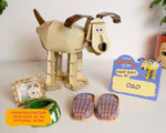 Includes Gromit’s personalised dog bowl, tasty bone, cosy slippers, and a framed photo of Wallace and Gromit.
