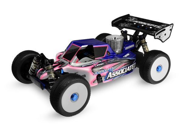 JConcepts hit the ground in Vaasa, Finland with an all new body design specifically for the IFMAR World Championships. Cleverly named, Finnisher, the unique design quickly rose to the top of the field during competition and proved effective on the ground and in the air. Designed with aspects learned from the Punisher line of bodies, the Finnisher provides an even more aggressive look with included details which remain crucial to performance. JConcepts is pleased to introduce the Finnisher body design specifically for 1/8th buggy racing. The RC8.2 Finnisher body is a drop fit for the popular vehicle and bears a stunning look with its cab treatment, styling and aggressive personality.