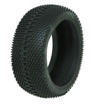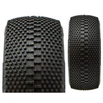 This is the Square Impact tire. This tire excels on indoor and outdoor hard packed but slippery surfaces with either dry or wet conditions. These tires offer less sidewall flex, improved response and offer an overall saving of weight. The distance between center bars offer much more forward traction than other small pins treads.