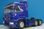 Scania is a world-famous manufacturer of large trucks and buses, and this is an R/C model of the 620hp V8-powered 3-axle R620 6X4 Highline, the flagship model of their 2005 International Truck of the Year-winning R-Series range. The characteristic styling of the truck's body is reproduced down to the smallest detail. The cabin tilts forward just like the actual truck and the included grille mesh and metal transfer emblems further enhance the realism look of the truck. The model features a ladder frame chassis with aluminum channels, 3-speed transmission, suspension with metal leaf springs and friction dampers, and rear axles equipped with differentials. Exterior details such as side panels, fuel tanks, and rear fenders provide the finishing touches. Kit-included coupler enables linkage with any of Tamiya's currently available 1/14 scale trailers, and the R620 is compatible with a wide range of Tractor Truck Option Parts as well.
