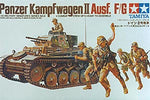 Pzkpfw II with specifications described above played the key role in the Blitzkrieg. At the start of this Blitzkrieg, the German tanks numbered 2580 in all, of which nearly half amounting to 955 in number were the Pzkpfw II. In 1940, mass production of the F type was started. The new Pzkpfw II was reinforced in its frontal armour (thickened to 35mm) and side (to 20mm). However, the improvement added its weight and its overall weight reached up to 9.5 tons. The main gun was replaced with a 20mm KwK 30 machine gun. The gun used to be an anti-air MG but remodeled into a main gun for a tank. Frontal armour to cover upper hull, also, was changed into a plain single-piece plate. Further, a false look-out window beside the genuine one for the driver and another for the same were newly added. These were the distinct features of the F-type tanks. After the F-type ones, those of the final mass-production type G were produced. Their main guns were much more powerful KWK 38 MGs, and each tank of this type was fixed a sundries-box at the rear of gun turret. These two were main features that clearly distinguished the G type from the preceding ones.