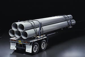 The Tamiya Pole Trailer in 1/14 scale is a radio controlled truck trailer suitable for use with any Tamiya radio controlled truck. The Pole-Trailer is able to carry pipes of various lengths due to its collapsible pole. The trailer also features an aluminum chassis and 4 highly detailed wheels. 5 plastic pipes of 55mm in diameter and 75cm in length are included.