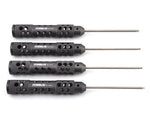 The ProTek R/C "TruTorque SL" Metric Ball End Hex Driver Set features large 20mm diameter handles with machined relief holes and cross hatch knurling to reduce weight and provide a high grip surface. The end of the handle features a rotating end cap that allows the tool to spin in your palm, maximizing comfort during long wrench sessions. Plus, the tip size is laser etched in not one - but the THREE different spots on the handle to help simplify identification.