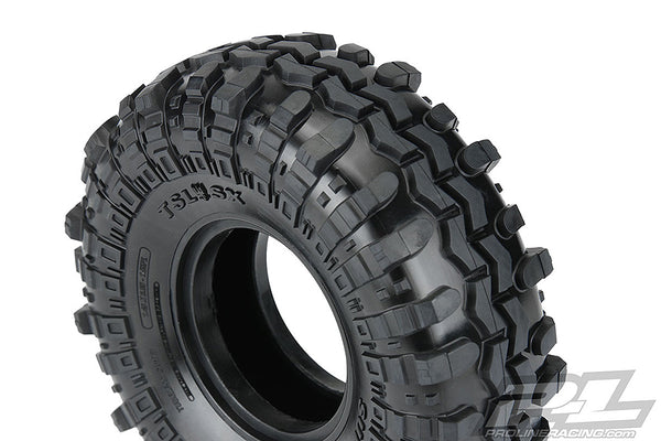 The full-size Super Swamper® TSL SX features the ultimate tire tread design by pairing the distinctive chevron tread pattern with the famous, trademarked, and patented Interco® TSL (three-stage lug) tread design. TSL is a lug pattern with short, intermediate, and long lugs that are each uniquely arranged, proportioned and spaced which allow them to bite quickly and self-clean rapidly. Each of these details has been faithfully recreated in Class 0 size to fit your 1.55" wheel. Just like the full-size Interco® Super Swamper® TSL SX tires, Pro-Line tires are proudly Made in the USA.