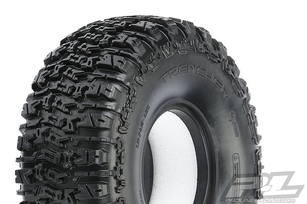This is a pair of Trencher 1.9" Rock Crawling Tires. The almighty Hyrax finally has some real competition with Pro-Line's all-new 1.9" (4.75" Tall x 1.81" Wide) Trencher Tire! Inspired by Pro-Line's insanely popular all-terrain Trencher tread, this Class 1 legal crawler tire is ready for anything your Scale Adventure might throw at you. The Trencher 1.9" features an extremely aggressive tread pattern with each tread block containing multiple sipes and multiple levels for incredible tread flex while still looking great on a Scale Rig. The highly detailed connected tread on the sidewall of the Trencher extends out for great side-hilling performance that only slides out when you want it to! The Trencher 1.9" tire is made from Pro-Line's Legendary G8 material and Super Soft Predator Compound, so you know it provides the performance you can depend on. The future of 1.9" tire performance is here with Pro-Line's new Class 1 Trencher tires! Get your own set of Trenchers today!