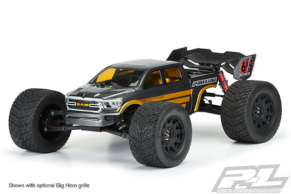 This is a Pre-Cut Ram Rebel Clear Body for Kraton 6S. Pro-Line is proud to introduce the new 2020 Ram Rebel 1500 body for Kraton 6S Monster Trucks! This Ram body is perfect for giving your Monster Truck a tough and modernRam Rebel look while also making your friends jealous. The Ram Rebel body comes clear allowing you to paint and recreate your favorite full-size Ram Rebel or Big Horn edition truck since Pro-Line includes two different grill and headlight trim options along with other detailed graphics on the sticker sheet. Just like the Brute body, the Ram Rebel is Pre-Cut and made to fit your ARRMA Kraton 6S perfectly and is made from durable polycarbonate. Don't show up to the local bash spot with the same body as everyone else... Get your 2020 Ram Rebel 1500 Body from Pro-Line today!