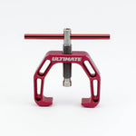 This is the updated Ultimate Racing Flywheel Remover .12-.21 Pro. By clamping the red anodized aluminum fork behind the flywheel and turning the shaft the flywheel is pulled away from the crankshaft, eliminating the need to use a hammer or other tools to loosen a tightly fitted flywheel.